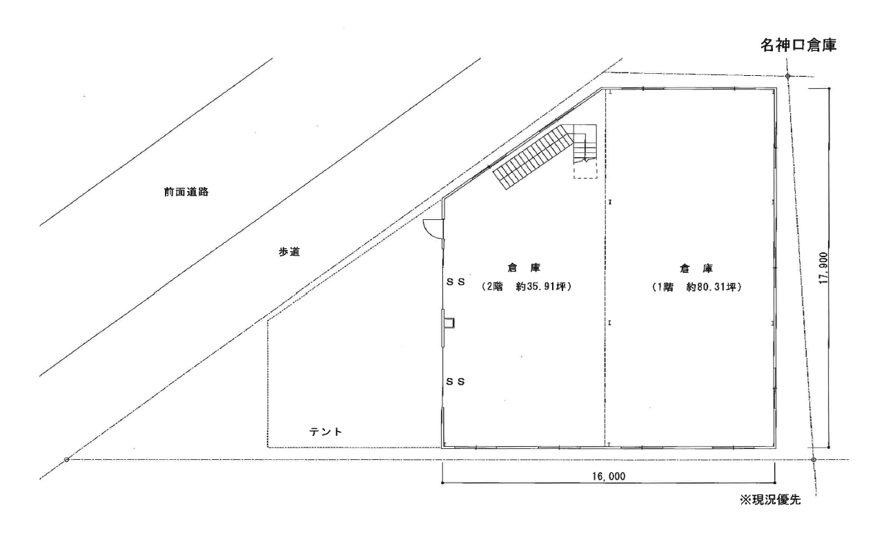 準工業地域・駐車スペース有・1階倉庫約80.31坪、2階約35.91坪