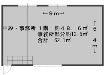 1階48.6㎡・中2階事務所約13.5㎡、空家内覧できます!