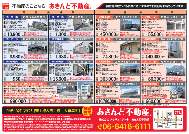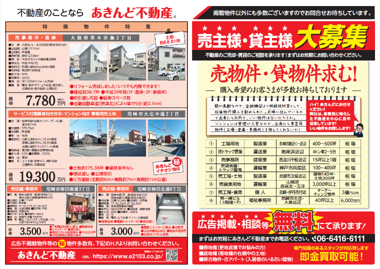 このほかもチラシに未掲載の物件を多数ご紹介可能です、不動産物件の事なら些細なご質問からご相談まで是非一度、あきんど不動産 06-6416-6111 までお問い合わせください!
