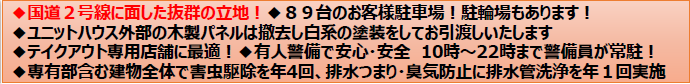 国道2号線に面した好立地!89台のお客さん駐車場・駐輪場あり!